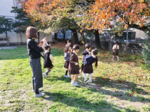 テーマは、校庭での秋探し(野鳥、植物、昆虫)とネィチャーゲーム(カムフラージュ、森の顔探し)をしました。