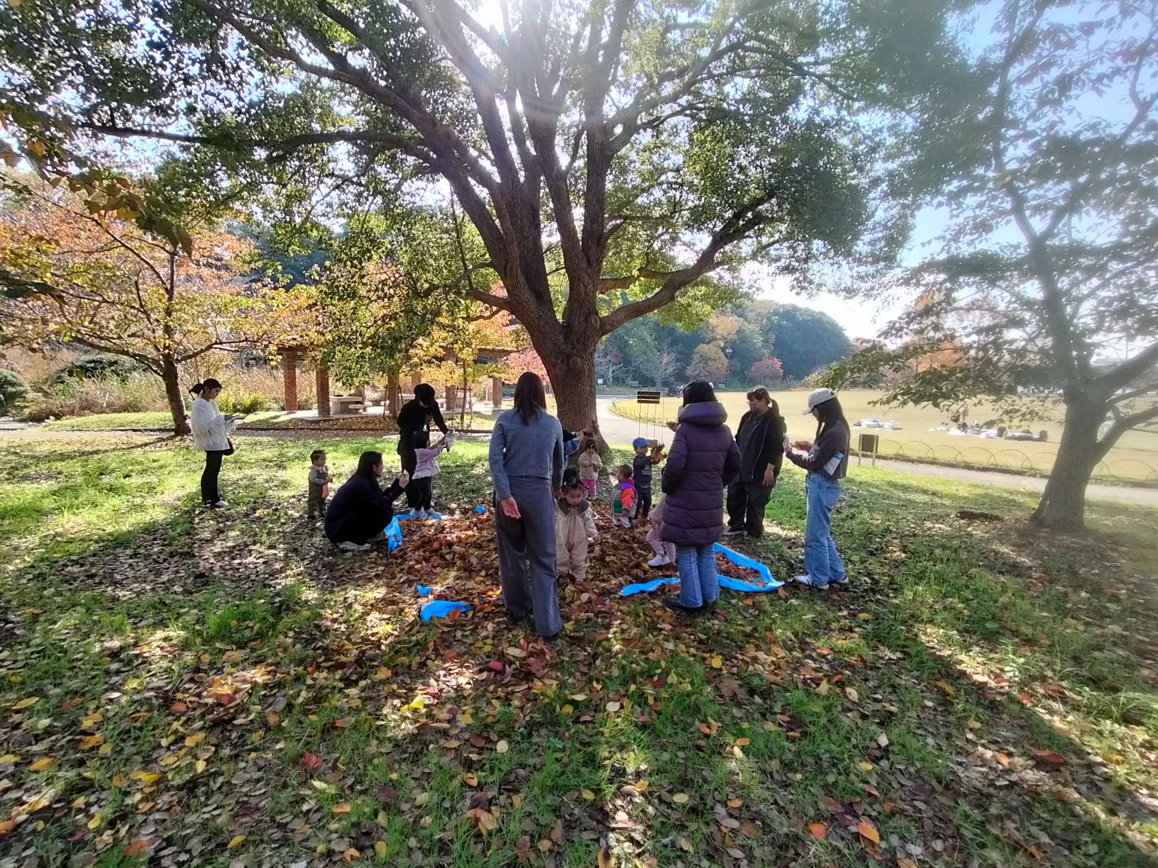 ③ 最後に、集めた落ち葉をためた場所で、みんなでトランポリ