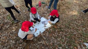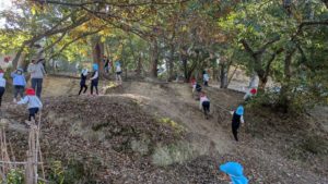 幼稚園のこども達と幼稚園のすぐ前の林で環境体験学習(ネイチャーゲームと観察会)を実施