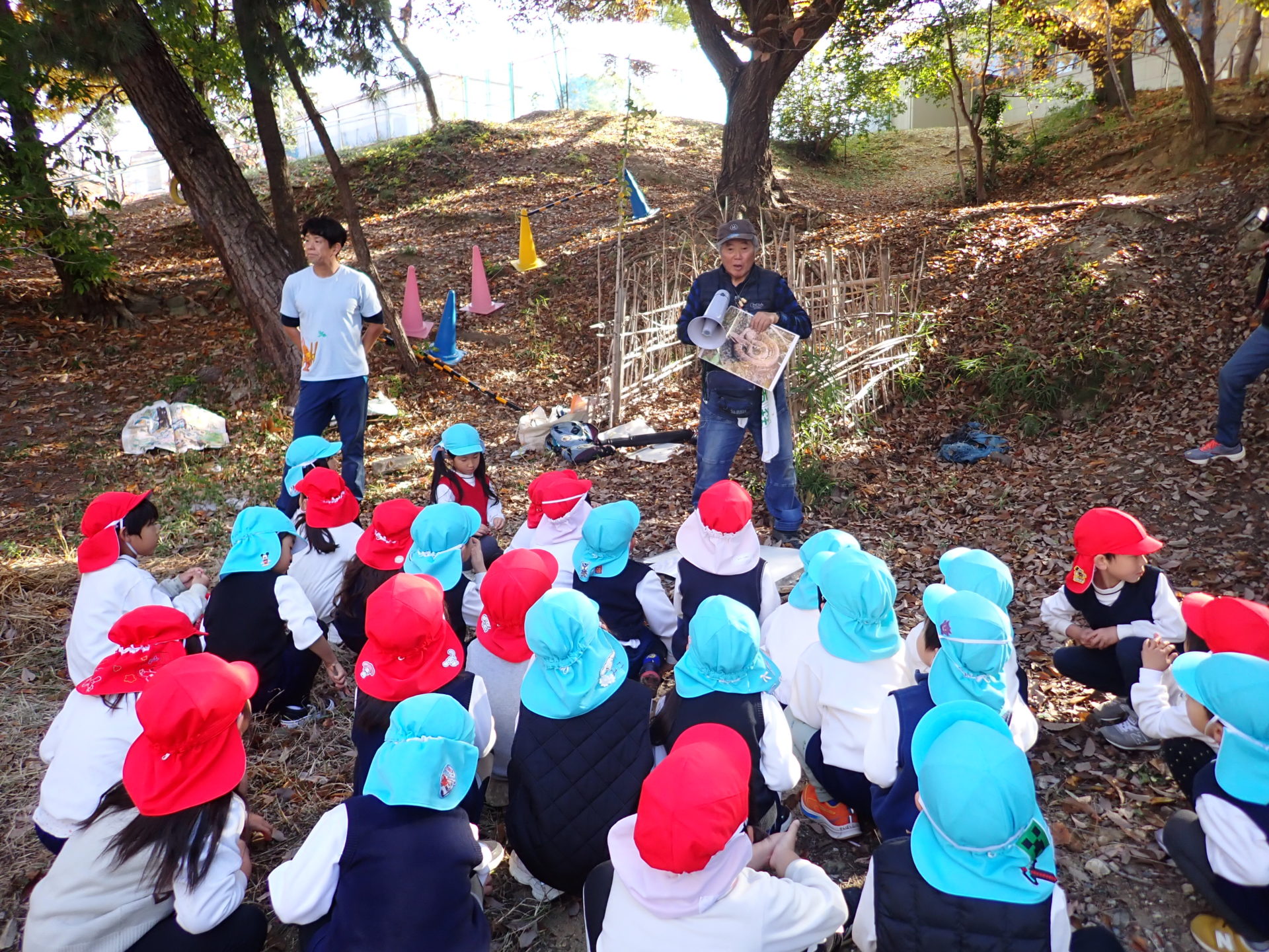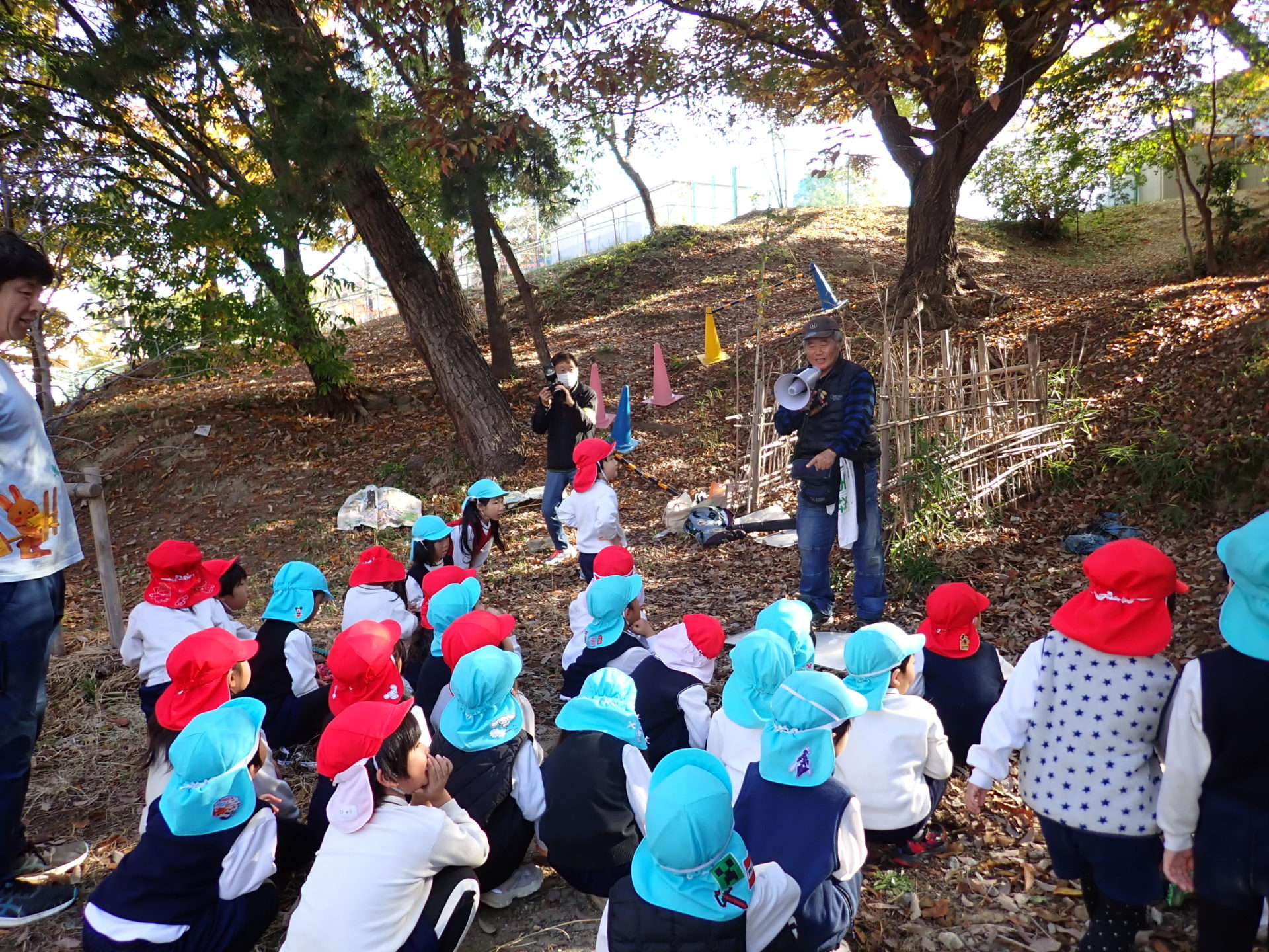 明石市立幼稚園のこども達約25人と幼稚園のすぐ前の林で環境体験学習(ネイチャーゲームと観察会)をしました。
