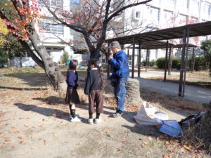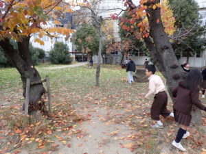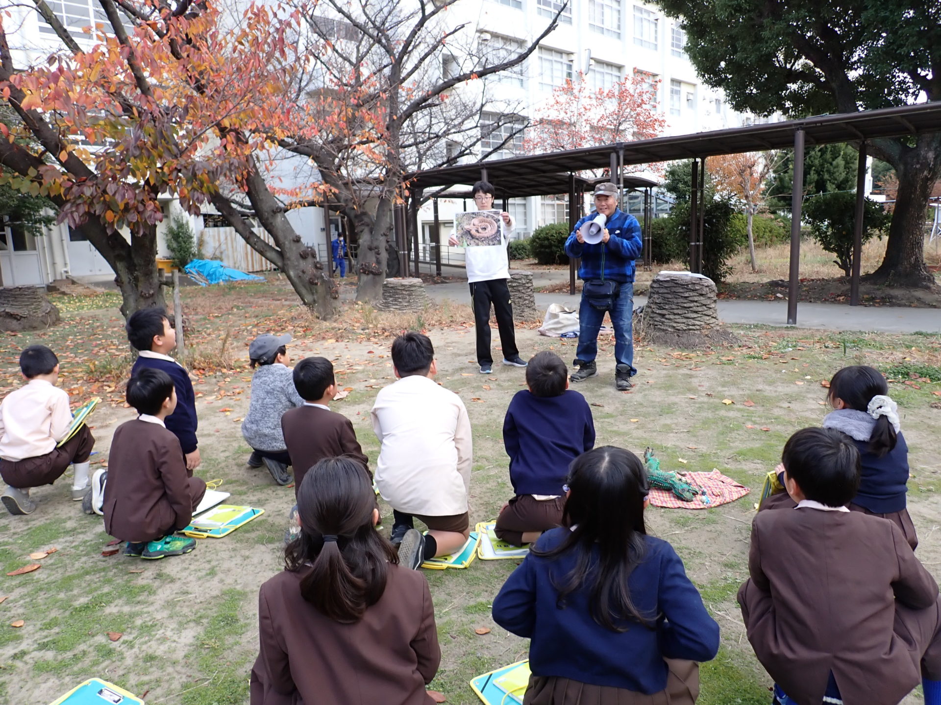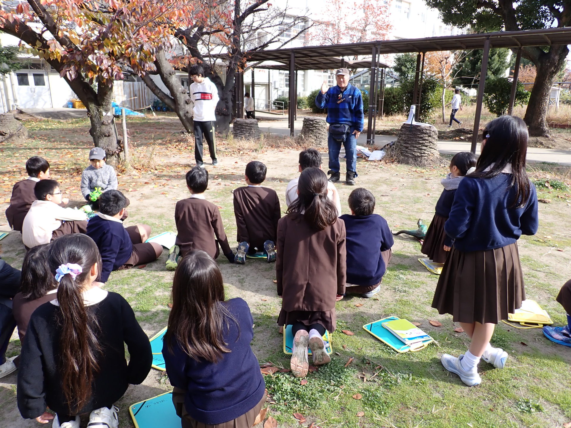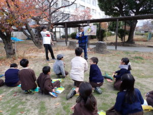 尼崎市立小学校3年生1クラスの子ども達と校庭で、ネイチャーゲーム(カムフラージュ、森の顔探し、森の色探し)をしました。